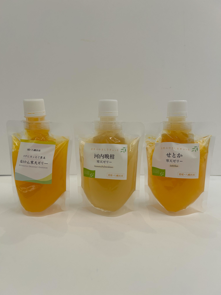 当日私たちが販売したのは、果実の味わいを活かしたみかんゼリー(塩みかん/河内晩柑/せとか)と、
